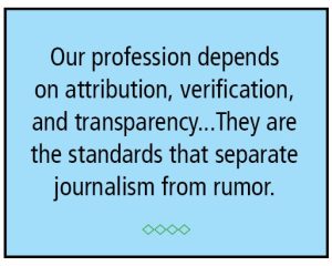 Our profession depends on attribution, verification, and transparency. Those are not optional features; they are the standards that separate journalism from rumor. If the public grows comfortable with a world where assertions carry more weight than facts, the press will struggle to fulfill its role in democracy.